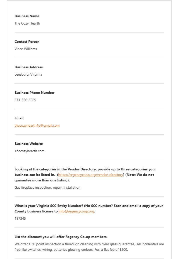 The Cozy Hearth’s service agreement and discount offered to paid members of the Regency Co-op can be found here.